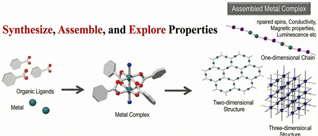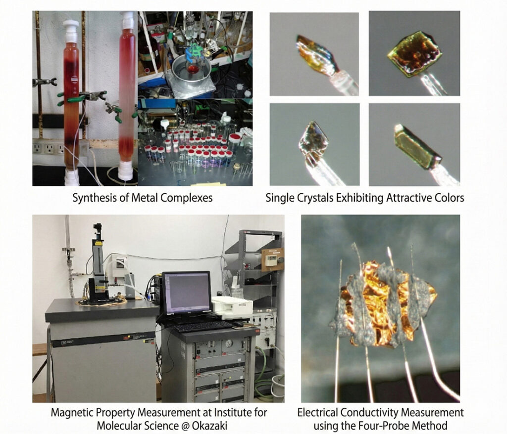 Metal complexes consist of metal ions with diverse electronic states and organic ligands that offer high design flexibility. When these two components are appropriately combined and arranged in an ordered manner, integrated metal complexes are expected to exhibit physical properties and functions that surpass those of conventional inorganic or organic materials. In our research, we synthesize metal complexes as fundamental building blocks and organize them effectively in the solid state to explore and develop novel physical properties.