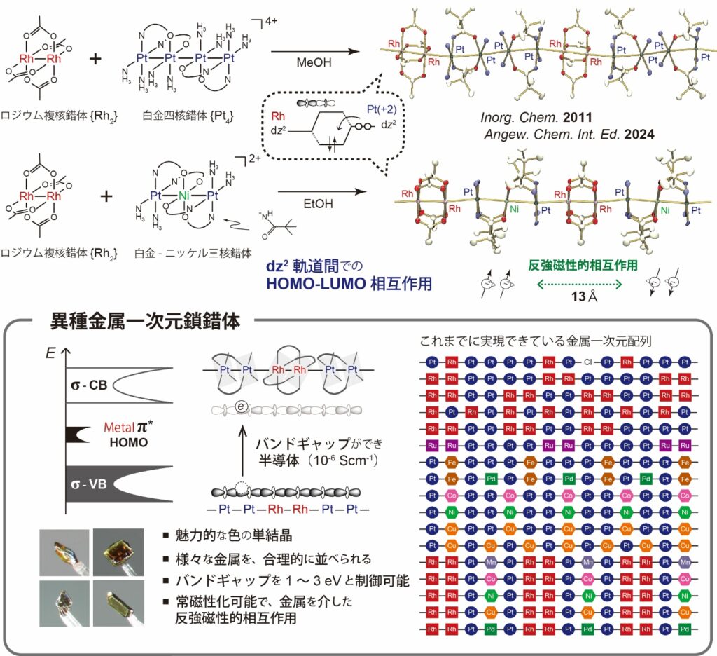導電/磁気物性の対象化合物であるd-バンドを形成する一次元鎖錯体は、KCP、マグナス塩、ハロゲン架橋のMXやMMXなどの、単一種金属が並んだ化合物があります。しかし、直接の金属結合を有する一次元鎖錯体は少なく、その理由の1つに、一次元鎖錯体の合理的な合成法が確立していないことが挙げられます。また、扱われる金属は、白金(Pt)、ロジウム(Rh)、イリジウム(Ir)、パラジウム(Pd)と非常に限られています。そのような中、私は、2種類の金属錯体同士のHOMO-LUMO相互作用を利用して、複数種類の金属が並んだ新しいタイプの一次元鎖錯体の合成に成功しています。様々な金属を自在に数珠繋ぎに並べ、そこでの新しい物性発現を狙っています。