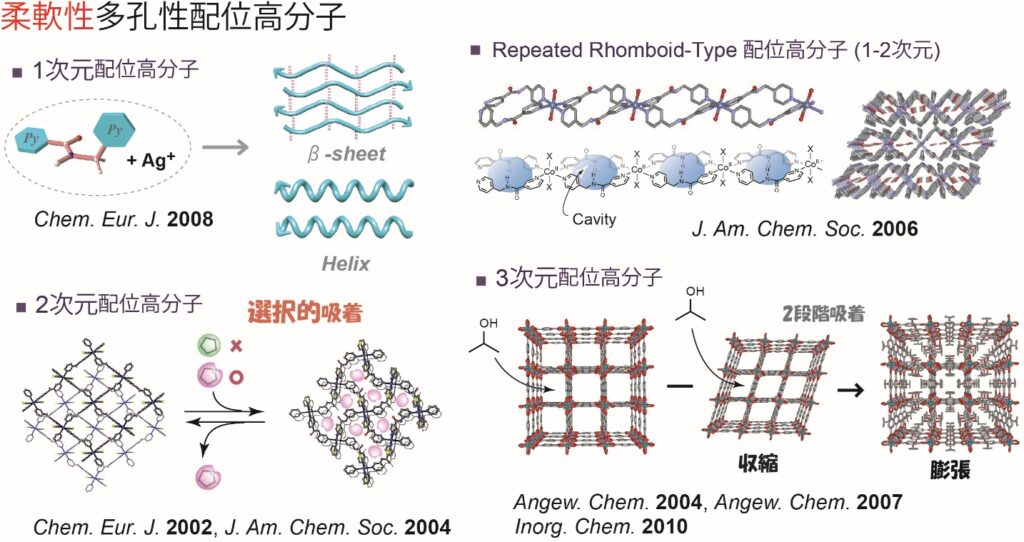 多孔性配位高分子とは、金属の配位方向とデザインされた有機配位子からなる、細孔を有する金属錯体であり、活性炭やゼオライトと同様に細孔性材料として期待されています。下図のように、様々なトポロジーをもつネットワークが形成可能で、この多孔性配位高分子の新たな機能性を模索しながら、新規物質の創製を進めています。